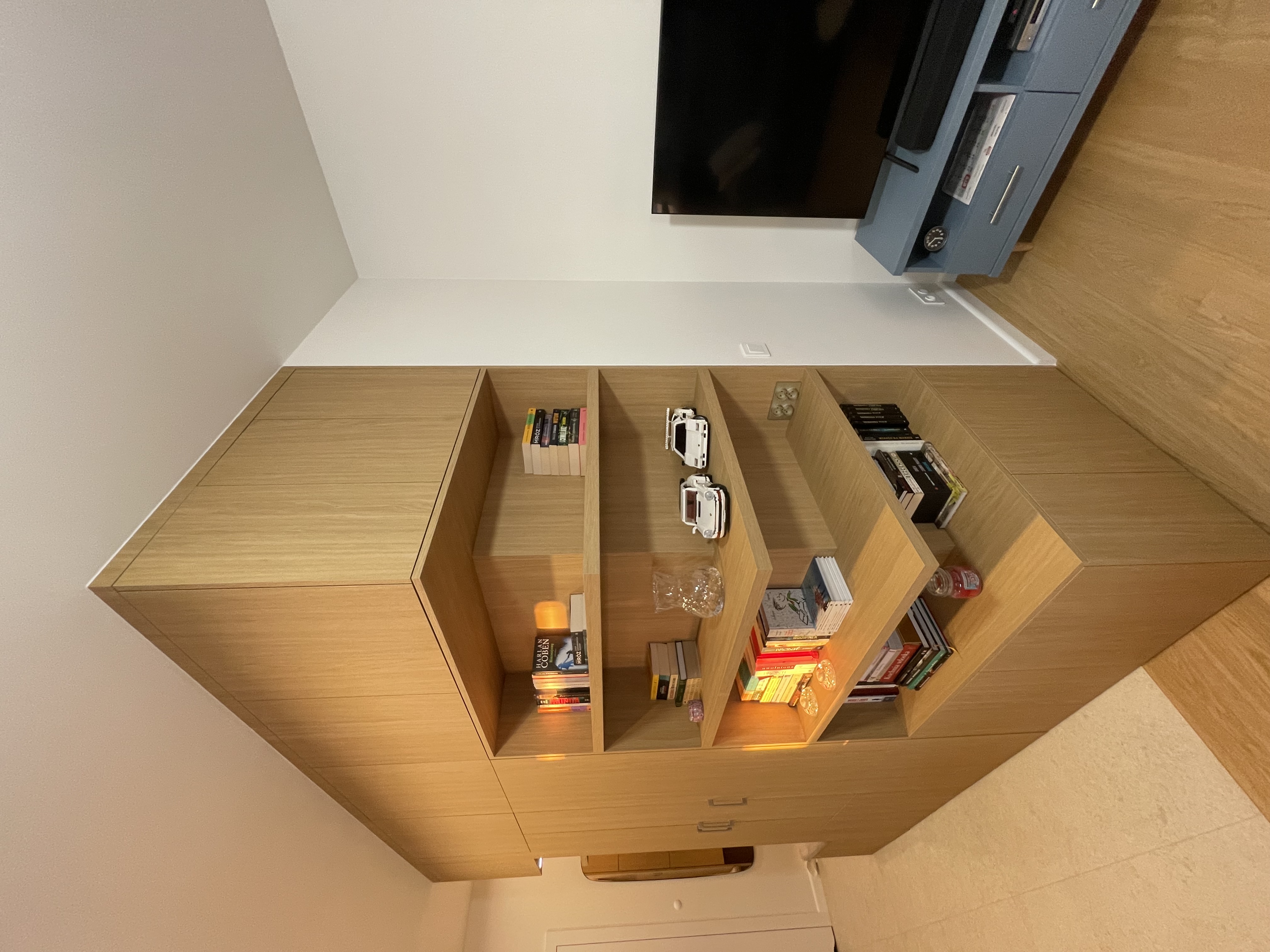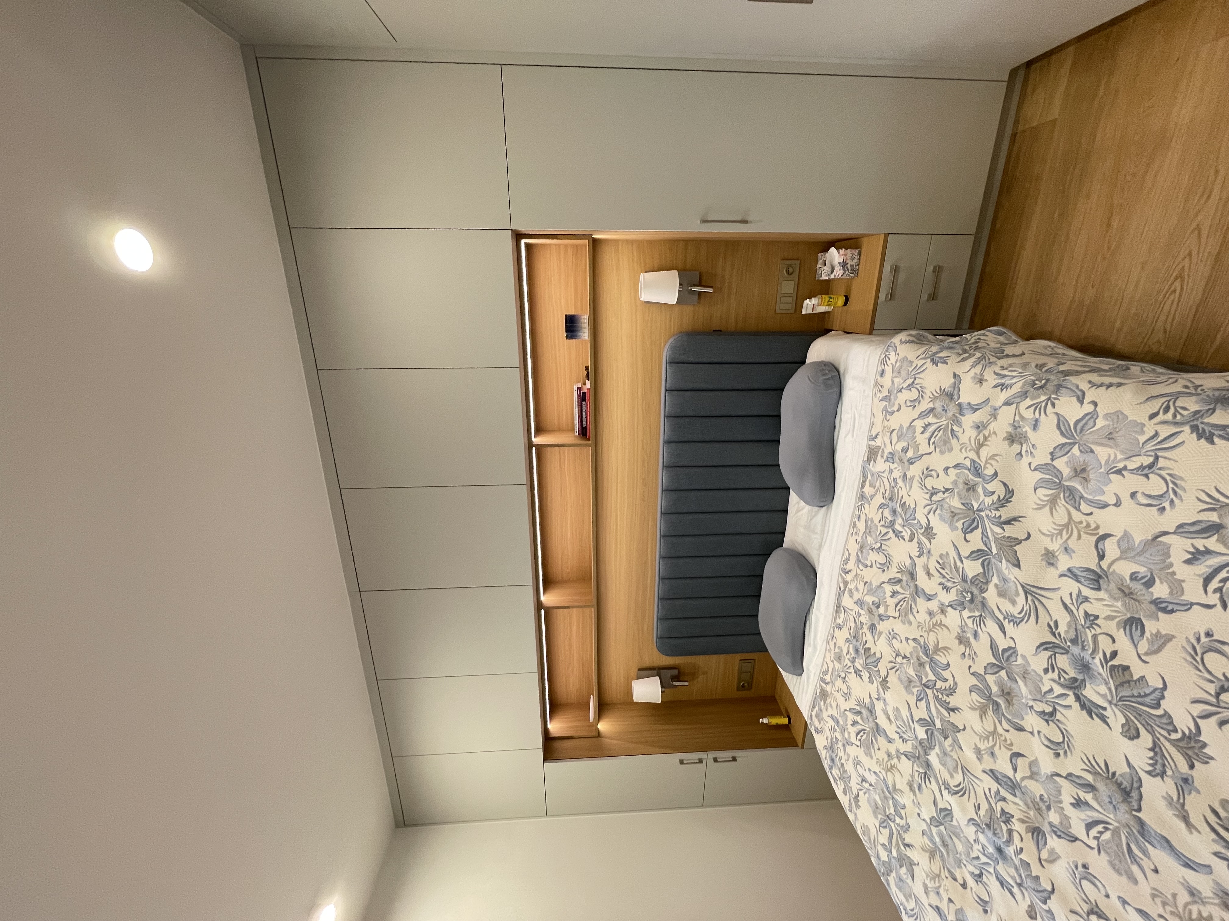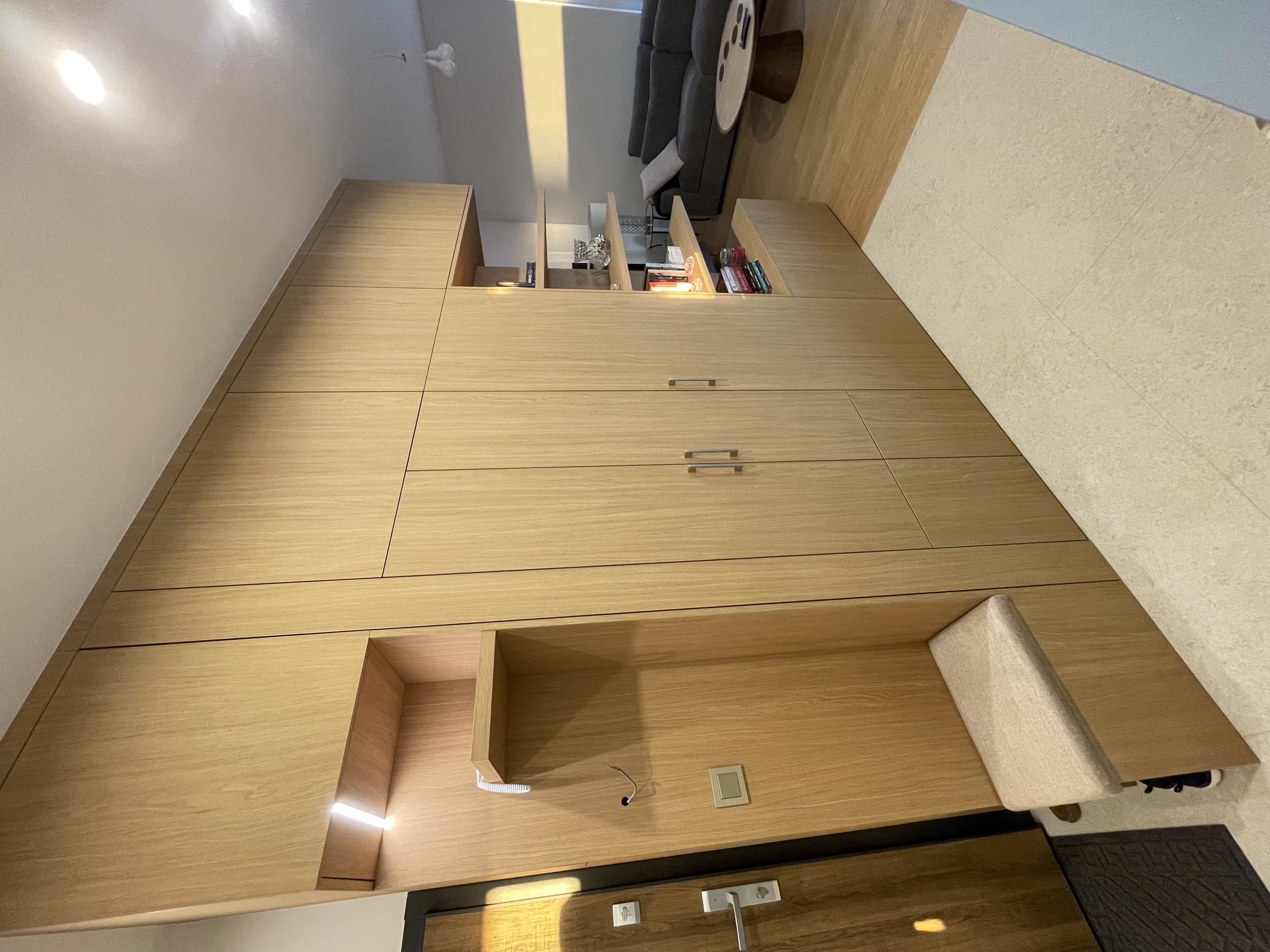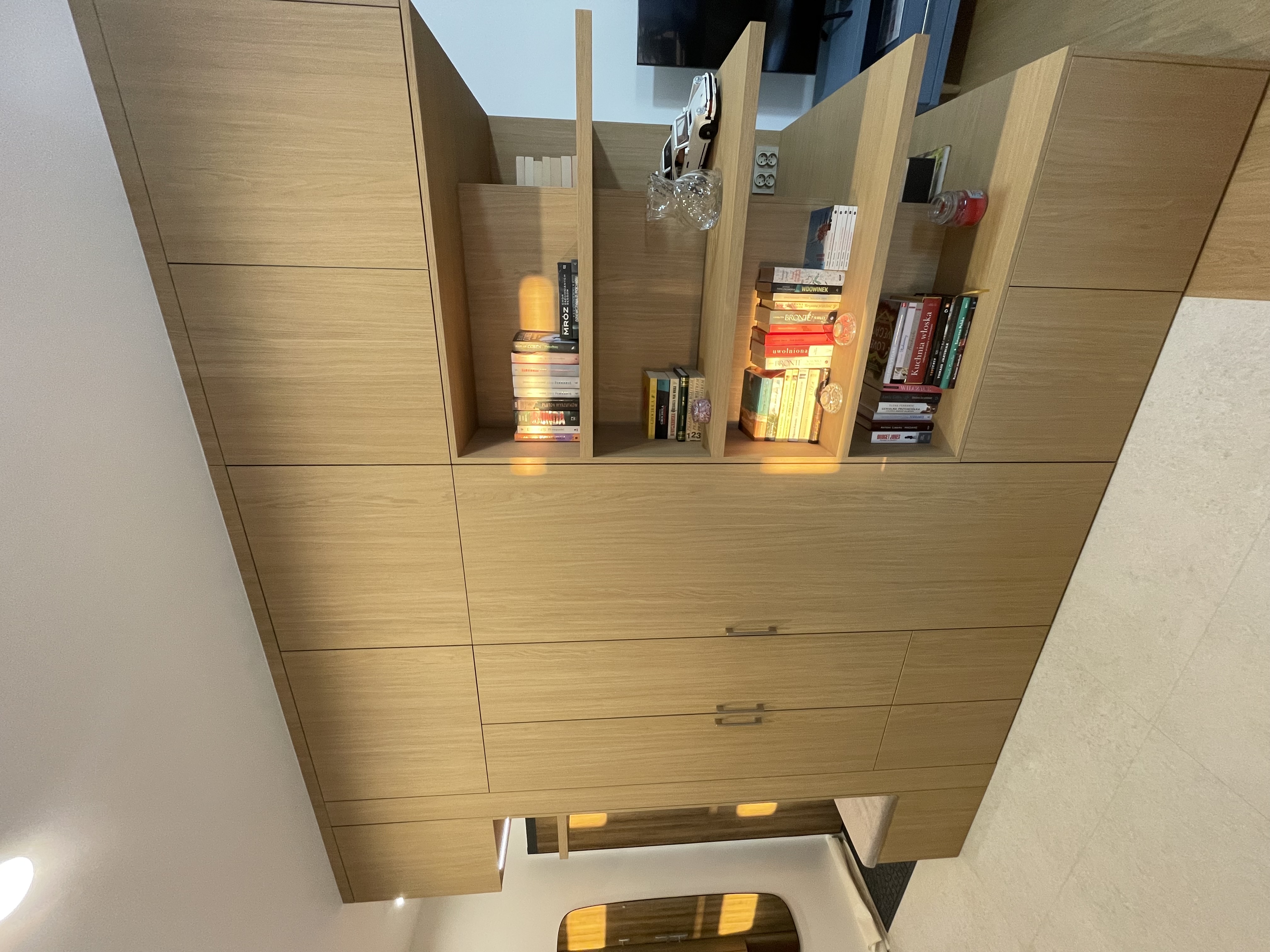 - Półki i schowki: Otwarte wnęki w dekorze drewna z podświetleniem – idealne na książki, dekoracje czy drobiazgi. Dodatkowo szafki górne i dolne oferują dużo miejsca na pościel, ręczniki oraz rzadziej używane rzeczy.