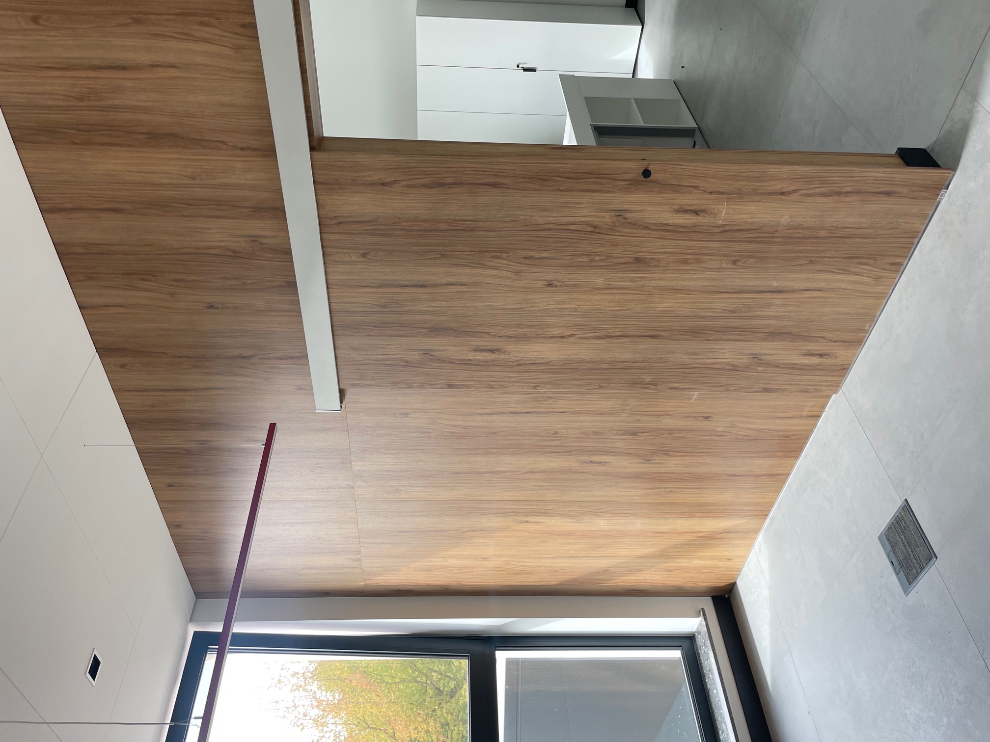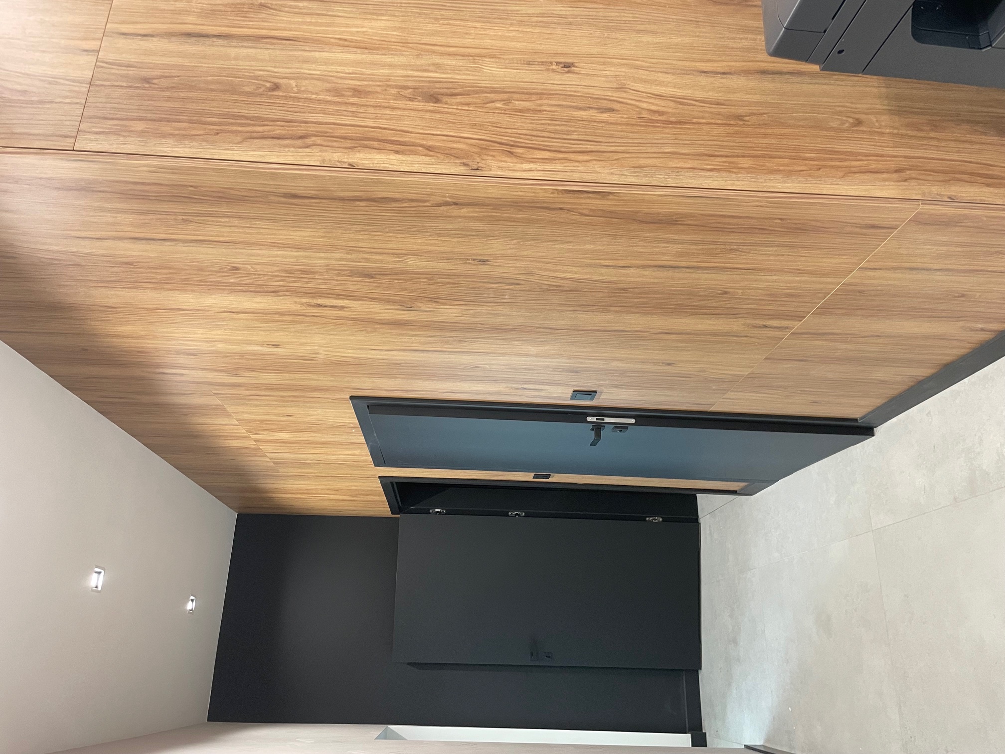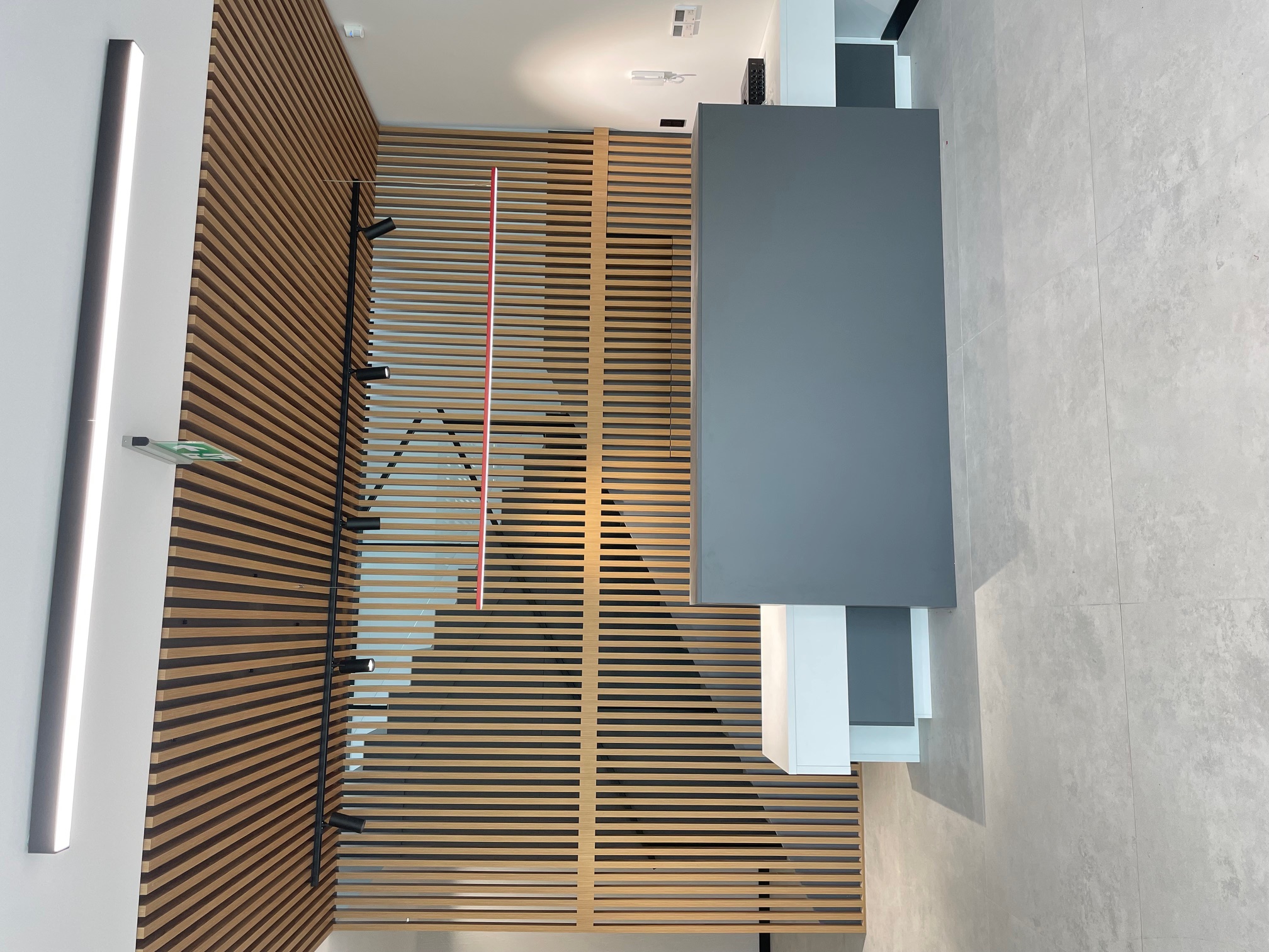 - Zabudowa klatki schodowej z lamelami drewnianymi: Efektowna ściana z pionowych lameli w ciepłym dekorze dębowym, optycznie ocieplająca przestrzeń. Połączenie z matowymi frontami szaf w odcieniu szarości i nowoczesnym oświetleniem LED (czarne reflektory na szynie). Całość nadaje wnętrzu dynamiki i elegancji.