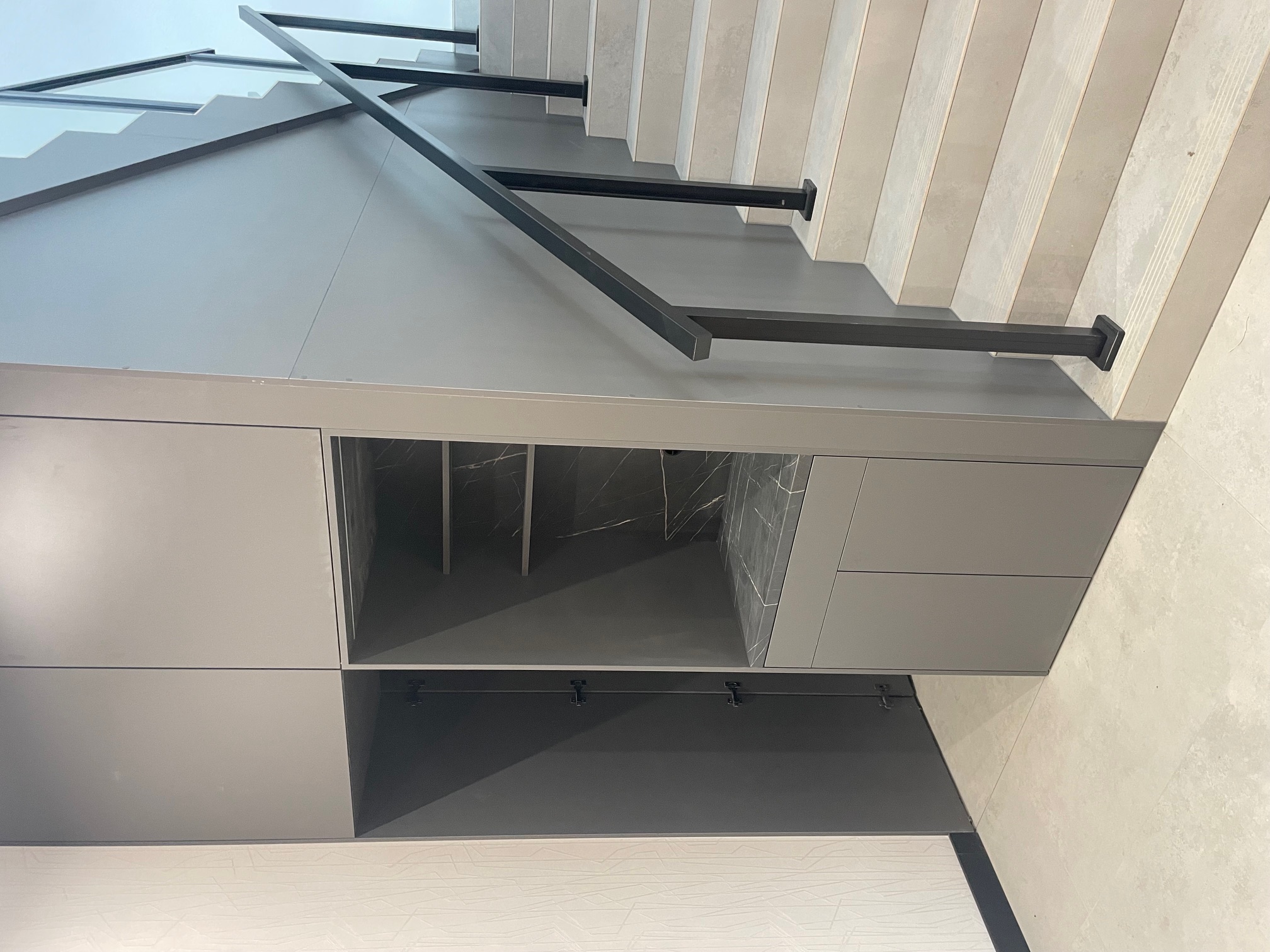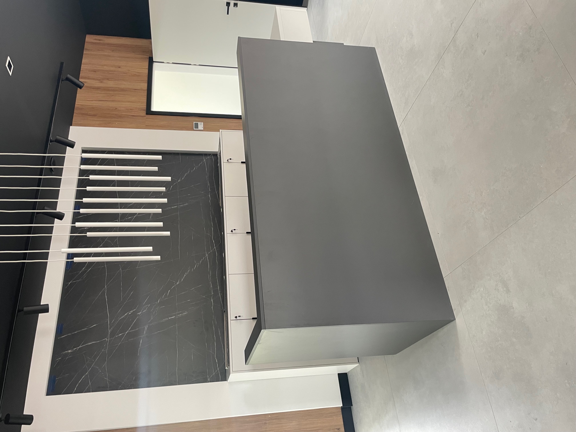 - Szafka umywalkowa w łazience: Wisząca szafka w matowym odcieniu szaro-beżowym z otwartą wnęką wykończoną dekoracyjnym kamieniem (marmurowy wzór). Czarne, minimalistyczne uchwyty i blat w tym samym kolorze – czysta forma i duża pojemność.