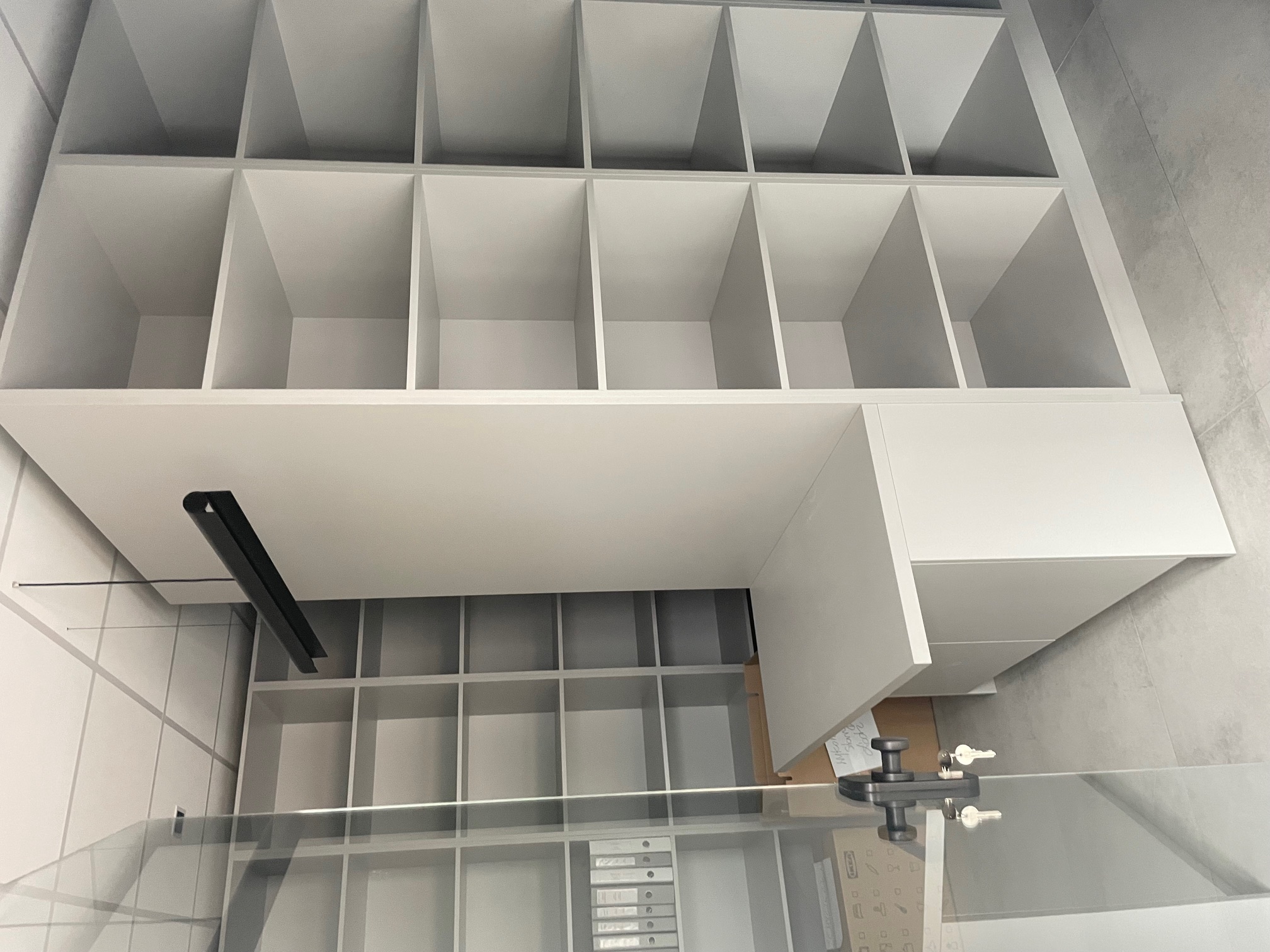 - Regały i szafki biurowe pod skosem: Praktyczna zabudowa wykorzystująca przestrzeń pod skosem – otwarte półki w różnych odcieniach szarości tworzące geometryczny, nowoczesny wzór. Idealne na segregatory, dokumenty czy dekoracje. Matowe fronty z systemem cichego domykania.