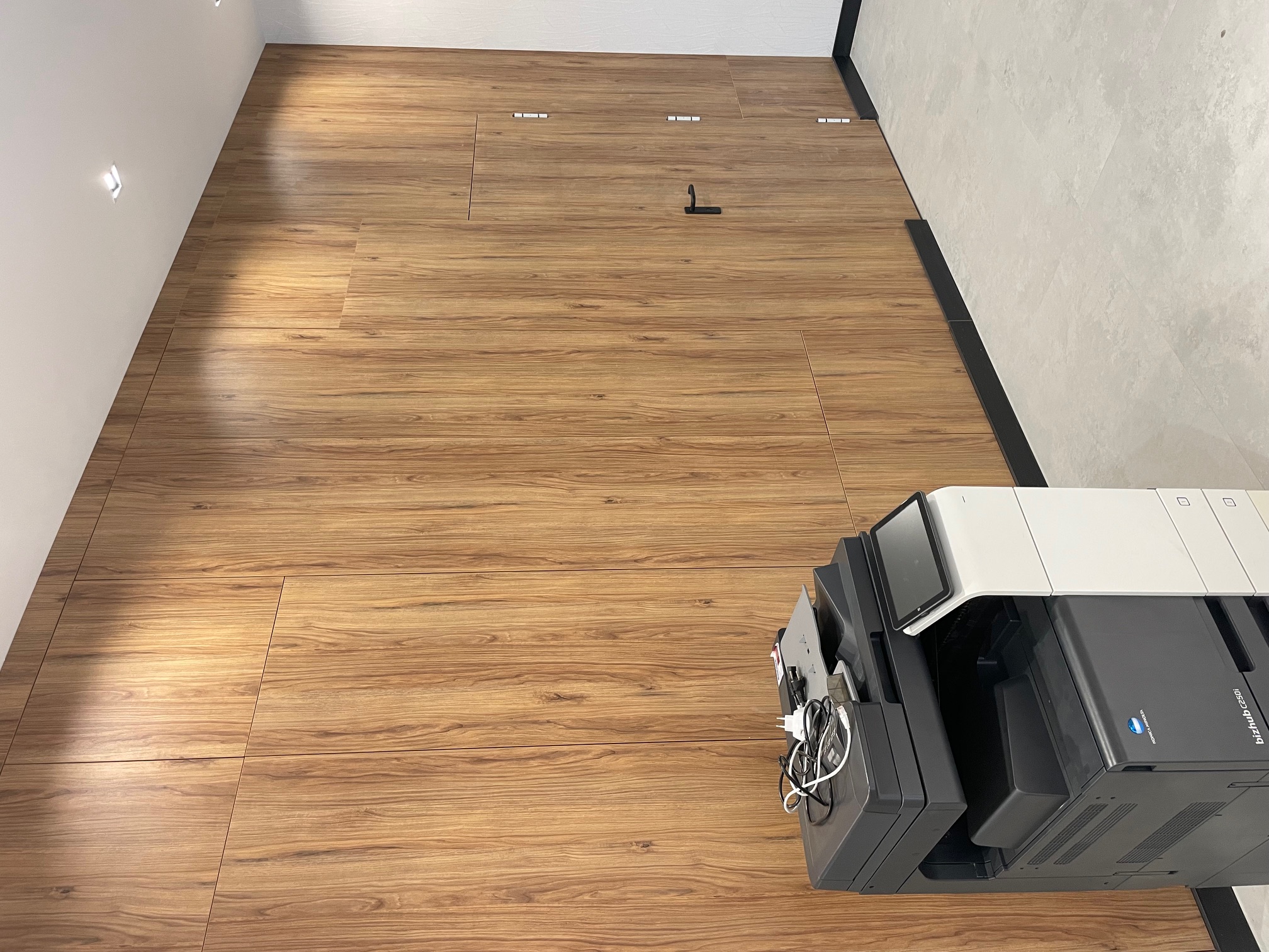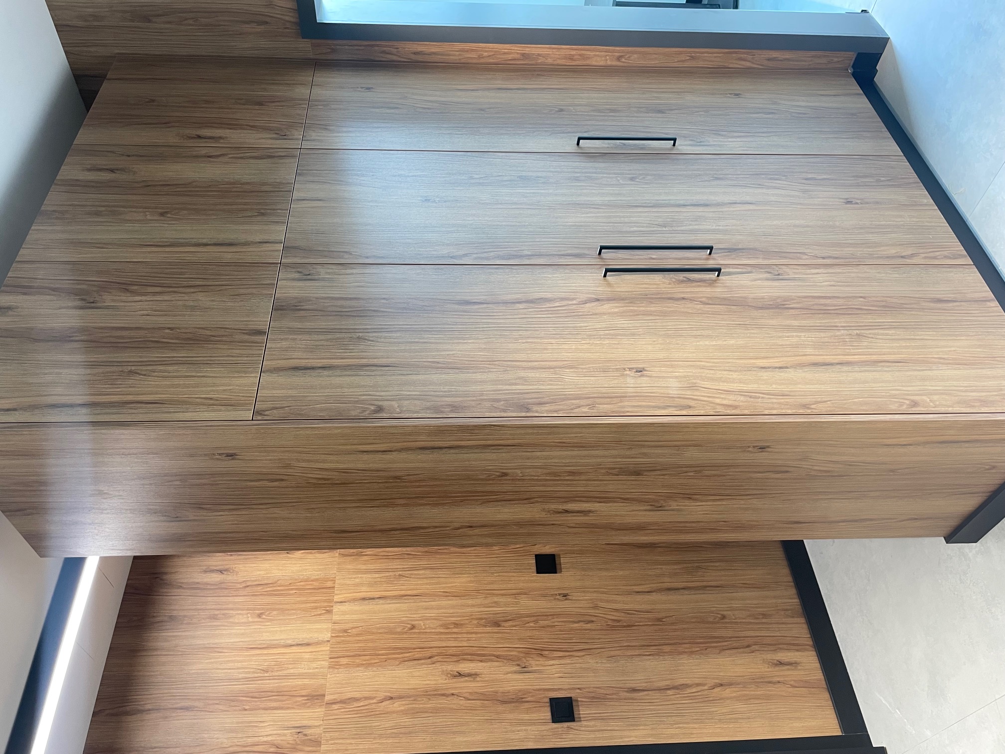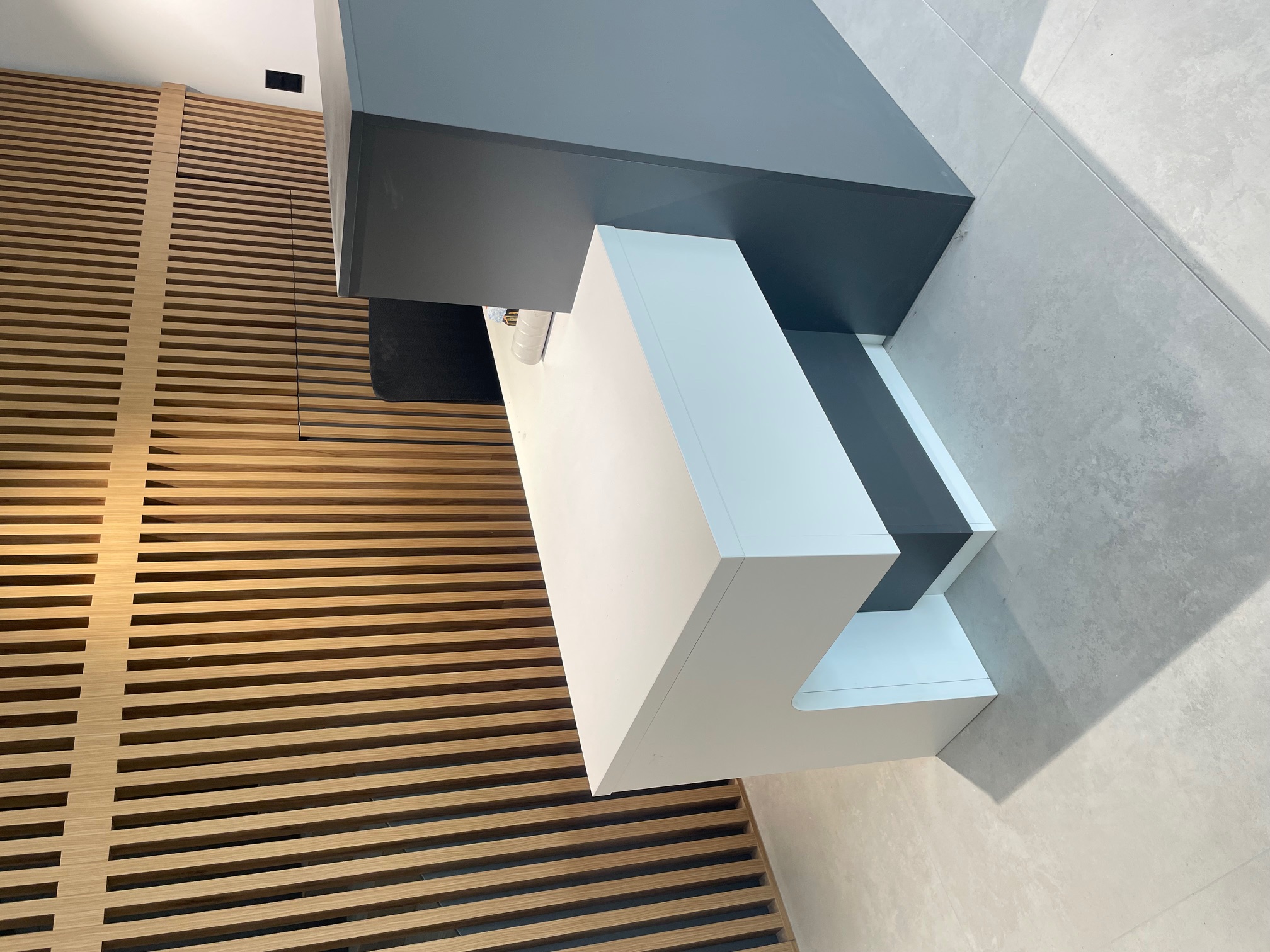 Wszystkie meble wykonane na wymiar z wysokiej jakości płyty laminowanej, – odpornej na wilgoć, zarysowania i intensywne użytkowanie w przestrzeniach firmowych. Wysokiej klasy okucia zapewniają trwałość i komfort codziennego użytkowania.