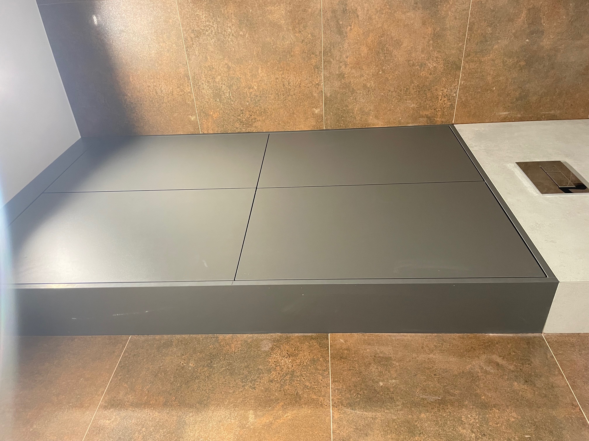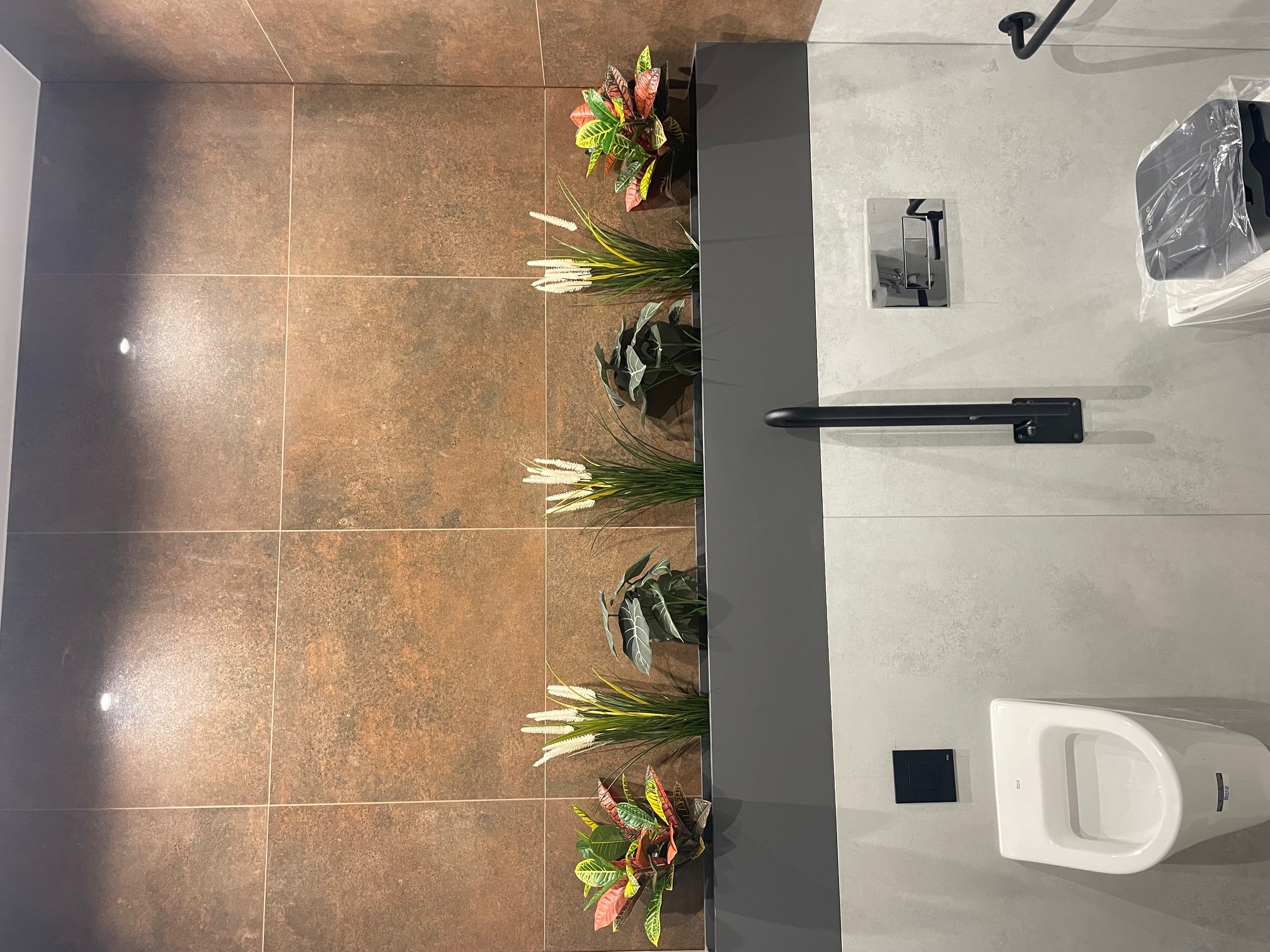 - Łazienka z zieloną ścianką i roślinami: Nietypowa, stylowa zabudowa z pionową ścianką w kolorze antracytowym, ozdobioną sztucznymi roślinami w doniczkach – wprowadza biophilic design i świeżość do sanitariatów. Czarne uchwyty i armatura kontrastują z ciepłymi płytkami podłogowymi w odcieniu rdzy.
